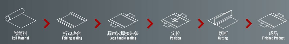 2.本機(jī)通過折邊后,再經(jīng)過左右兩臺燙把機(jī)把雙手提條焊好,裁切出來。